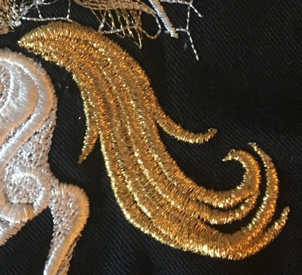 The snare was epic, there must have been fifteen maybe twenty strands all caught up in the bobbin. I was using scissors and thread rippers to free the fabric in the hoop. Finally it came free and I had a gaping hole where my tail should have been.